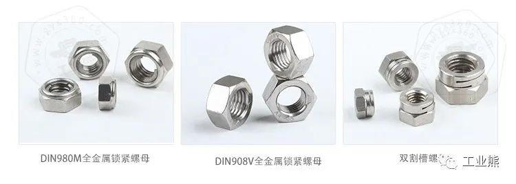 鎖緊螺母分為全金屬系列鎖緊螺母或者非金屬嵌件系列鎖緊螺母等。全金屬系列鎖緊螺母,一般會利用螺母變形防松的型式,一般通過割槽的型式,或者擠壓螺紋變形的型式,例如法標的雙割槽螺母,以及DIN980V鎖緊螺母,或者采用螺母頂部加裝金屬簧片的型式,起到鎖緊的作用,例如DIN980M鎖緊螺母。