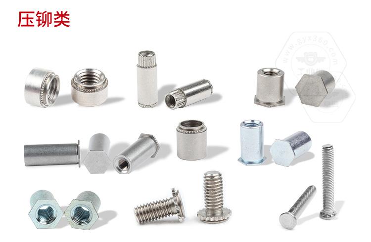 ●鉚螺母 壓鉚螺母又稱鉚螺母,自扣緊螺母,圓狀的外形,一端帶有花齒和導(dǎo)向槽,故又稱其為花齒螺母。為薄板提供高強(qiáng)度的螺紋鏈接,蕞小板厚可達(dá)0.03英寸-0.8毫米,螺紋尺寸#2到1/2英寸和M2-M10。