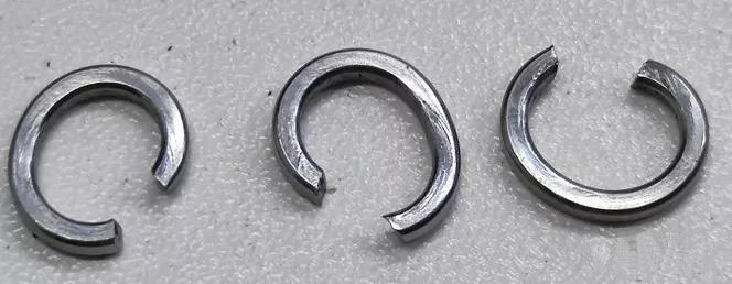 4、彈簧墊圈的切口毛刺:由于加工工藝的原因,切斷面后的彈簧墊圈切口處肯定存在或大或小的毛刺,彈簧墊圈經(jīng)過(guò)熱處理后,這些帶有較高硬度的毛刺或?qū)⒅苯忧度肫綁|圈或被連接件機(jī)體中,導(dǎo)致螺栓螺母擰緊過(guò)程中彈簧墊圈拉長(zhǎng)而墊圈失效。